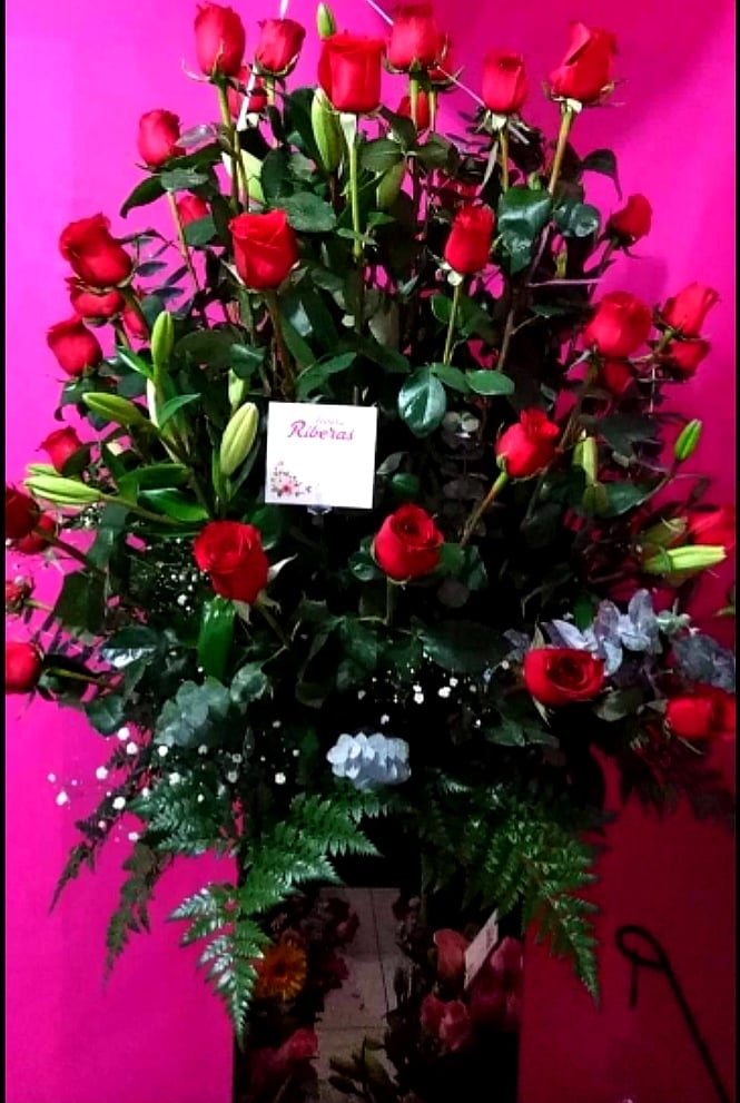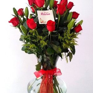 Be the first to review “ARREGLO EN BASE REDONDO CON 50 ROSAS ROJAS Y LILIS GRANDE”